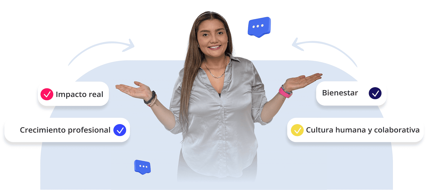 - Cultura humana y colaborativa: Nos importa el bienestar de las personas. Promovemos un ambiente de trabajo basado en el respeto, la empatía y el trabajo en equipo.